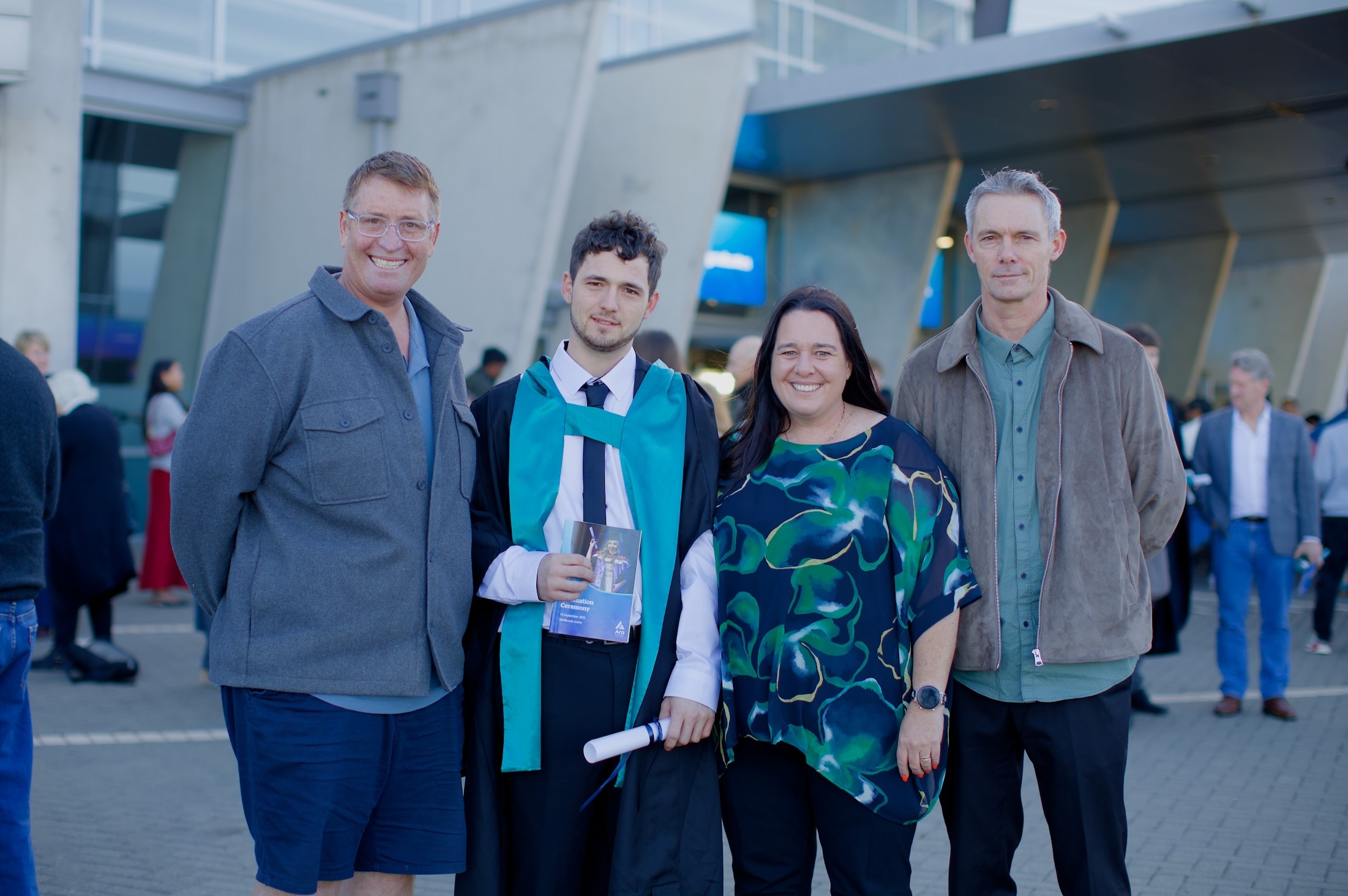 Jamal Cherry at Ara Spring Graduation had (from left) employer Steve Porter, mum Penny and dad Robert there in support