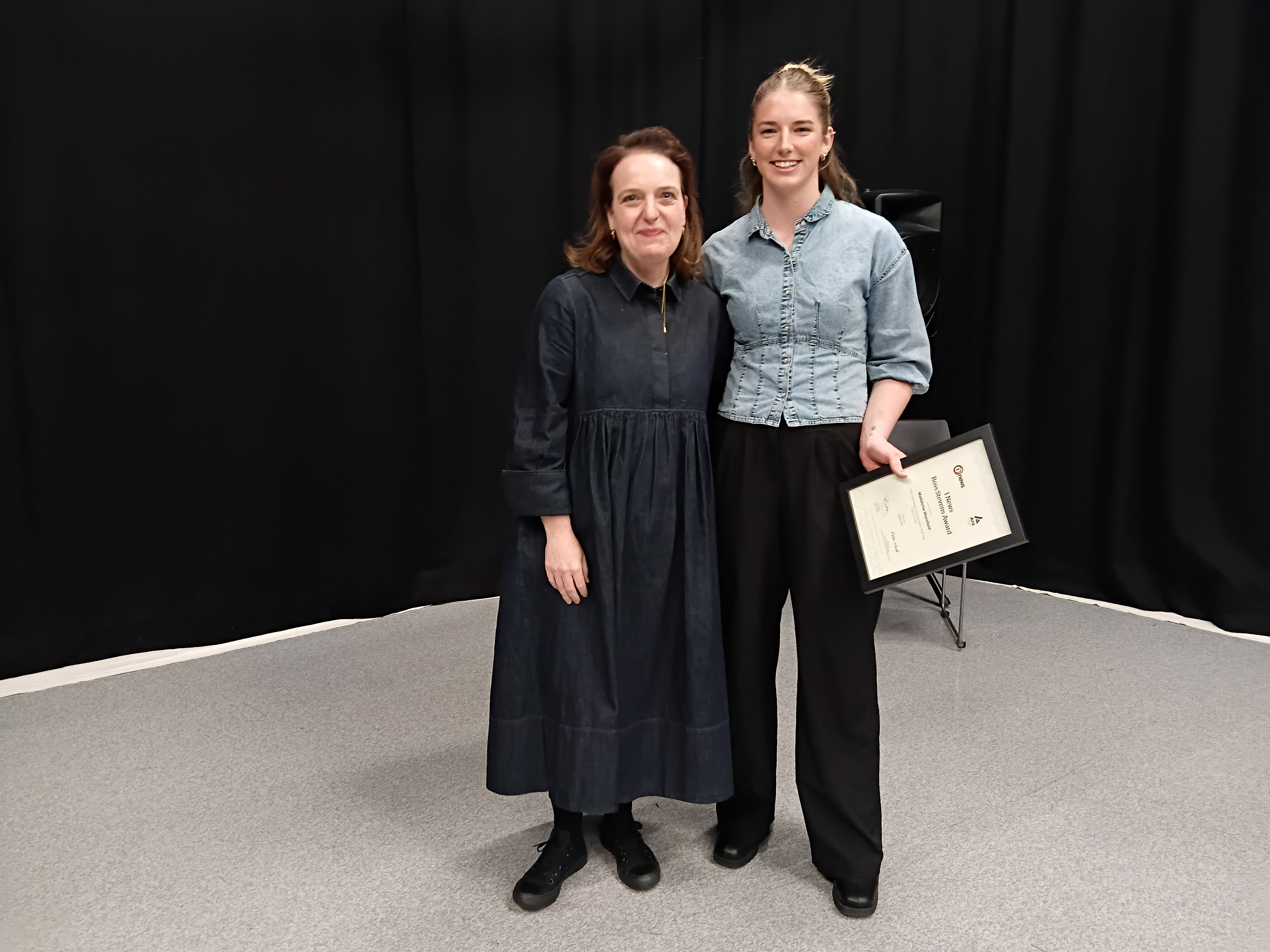 Left: Maddy's sights have long been set on becoming a sports reporter Right: With TVNZ’s Newsgathering Editor Laura Barnsley afer winning the Ross Stevens prize
