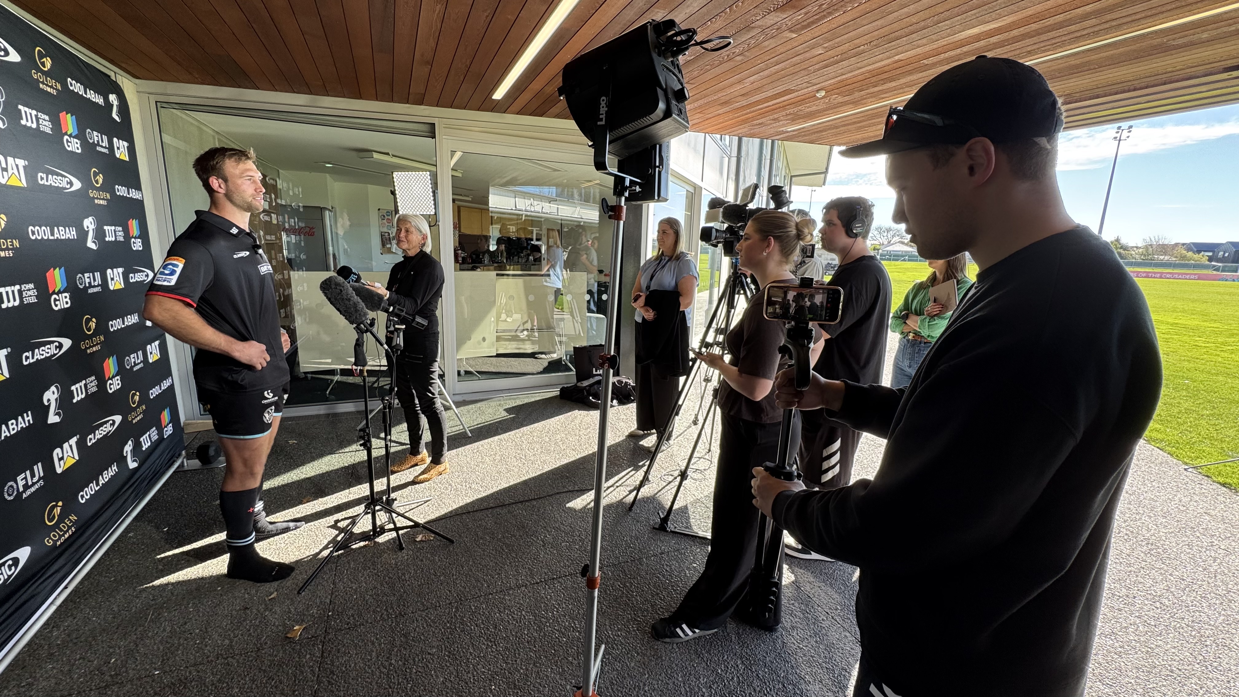 Maddy Mansfield (4th from left) in the middle of a media conference while producing content for Ara's Metro News