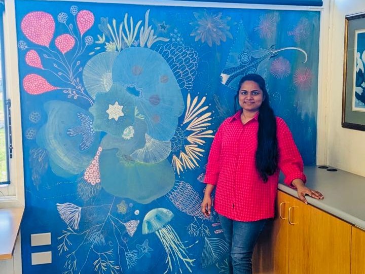 That transformation extends into her art. Working primarily in mixed media, Jayasekara connected with Envirohub, a Christchurch community space supporting environmental action and creativity, and created two large sustainability-focused works for their co-working space. The Living Ocean draws viewers into a marine ecosystem of corals, jellyfish and rays, exploring the ocean's role as the planet's largest oxygen producer. Voices of Nature celebrates Aotearoa's native biodiversity through pīwakawaka, tūi and native flora, exploring the fragility and richness of the natural environment.